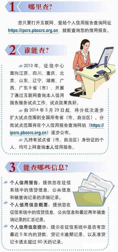 央行个人信用报告网上查询服务试点由目前的江苏、四川、重庆、北京、山东、辽宁、湖南、广西、广东、浙江、天津、新疆12个省区市扩至15个省份。凡是身份证号码前两位为32、51、50、11、37、21、43、45、44、33、12、65、31、42、63的个人都可以通过互联网查询本人信用报告。但身份证号码所属地不在上述15个省份之列,即便现在户籍已经迁移到这15个省份区域内,也暂时无法上网查询个人信用报告。个人信用报告查询方法:
